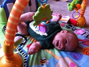 So at least he enjoyed it! She did some stretching of his hip flexors and ankle. We still see him do a slight ankle flexion in the left foot every now and then. No new movements beyond that. The feet are still very floppy. The hip flexors are still tight – he likes his legs up in front of him, not stretched down. While hard to tell with babies this young, there doesn’t seem to be much movement or strength of the hamstrings either.