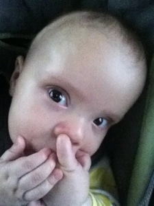 Here’s Colten soothing himself in the car as we get ready to head home… We’re hoping the finger up the nose while sucking on other fingers won’t be a habit. But he sure does love his fingers!