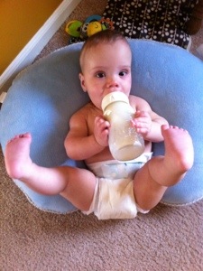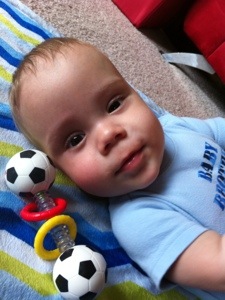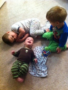 Other than that, at seven months old… he still sleeps through the night most nights, is happy as a clam most of the time, is getting introduced to various foods now, and just enjoys playing on the floor – especially when his brothers are around. He had a tooth break through, then it retreated back in, so he’s still actually toothless. No other medical issues recently – which has been nice, just some concerns about his bowels which I’m guessing he will one day not want to look back and realize the whole world (okay, at least those reading this blog) knows about them, so we’ll try to be a little discreet in that department.