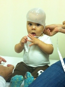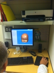 Either way, Colten was measured today for his helmet and will get it in about two weeks. Years ago, and maybe even still these days in some medical facilities, plaster molds were taken to get the current head shape. Now, more and more offices are using reflective technology and computer programming that allows for a laser-reading of the head shape and a computer generated mockup. From that data, a helmet is constructed that has foam (?) padding inside it. The padding is less in areas that the head needs to expand into, and is fuller in areas where pressure is needed to prevent further protruding growth. The helmet is in two pieces and connected by sliding screws and hook and loop (Velcro) straps. This allows the helmet to start small and expand a bit as the child grows. Colten will be measured every six (6) weeks down in Ann Arbor and the helmet will get re-adjusted as necessary by the orthotist.