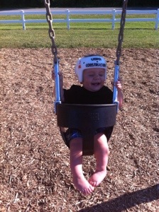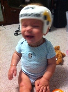 What else is Colten up to? He loves playing peek-a-boo now – covering and uncovering his own face or ours. He is starting to roll and “wrestle” with his brothers, he’s been clapping for a while and just started waving. He signs MORE and I swear he signed EAT one day but has yet to repeat it again. He finally developed his pincher grasp so he can pick up little bits of food and put them in his mouth (yay for self-feeding opportunities!). He still has a strong gag, or choke, so while most of his foods are pretty pureed, we do try to give some textured foods now too. He has six teeth, wears his helmet 23 hours every day without a fuss, attempts to give kisses, and is still the happiest kid in the world. Except if I leave the room. Then the floodgates open! Hopefully the separation anxiety will calm down, although with a new home in our future (2 weeks!), I’m guessing it will stick around a bit longer.