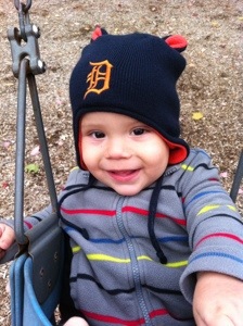 Recently we have been working on helping him figure out how to get up a small step at my parents’ house (yes, we are STILL at my parents; hoping to move the first week of December). When he goes from the foyer to the pool room (pool table, not swimming pool), there is a half-step and he easily crawls down carefully head first, pulling his legs behind him. But then he gets stuck and sits there and cries until someone comes to rescue him. When he tried to climb up, he uses his upper body and tries to pull his lower body up but ends up tightening at the hips and his legs were preventing him from getting anywhere. So we have worked to get him to pull a knee up and around. With our work, the physical therapist working on that, and the Anat Baniel practitioner working on it, and Colten of course working hard at it, HE DID IT! It was nice to see his smile when he made it up. It’s a small accomplishment but it’s another step toward independence for him and that’s what we love.