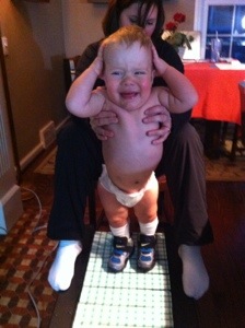 This coming week will tire him (and me) out… Wednesday he has a one-year checkup with our new pediatrician in the morning and physical therapy in the afternoon, Thursday is a Myelo Clinic day with a cranial doctor appointment sandwiched in there, and Friday is his final treadmill testing day and DEXA bone density scan. This is how Colten feels about treadmill time… although he is finally pushing long enough in a standing position that my arms aren’t going to fall off from holding him up!