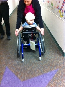 Tuesday of this week was a big PT session for Colten. It was arranged for the home medical supply rep to join us at the PT session to put Colten in a demo dynamic stander. In short, it’s a wheelchair you stand in instead of sit. I had looked at the stander online, I’ve seen videos of other kids in them and there’s a part of me that is excited for him to have another option for mobility. What I didn’t expect was the other part of me that welled up with tears when I saw the stander being rolled in. There was that part of me that was sad that my little boy couldn’t stand up on his own yet or take his own steps, and there was no telling when he might do those things and what sort of assistance he would even need to do them. The sadness passed quickly as I recounted to the physical therapist how Colten crawled up an entire flight of stairs at home earlier that day (under closer supervision from Daddy, and encouragement from cheerleaders Parker and Max)!