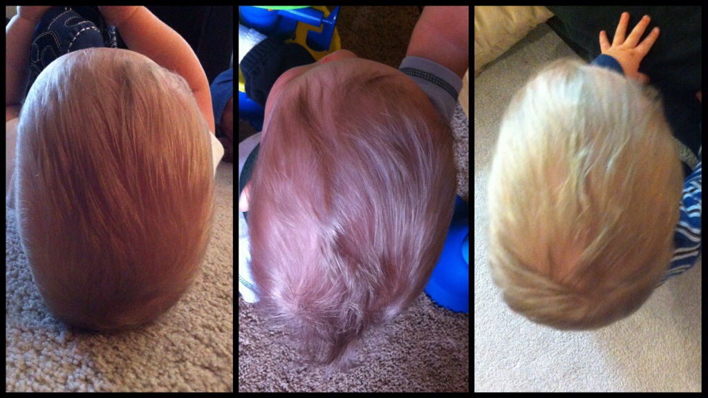Here’s a picture from before the first helmet, then after the first helmet, and now less than one month into the new helmet. His head is still long and narrow, but it’s finally getting fuller in the back than the front.