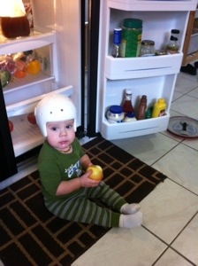 On the helmet front, we’re making progress! If you’ve been following the helmet saga, this is helmet #2. The first helmet that Colten had from about 9 or 10 months until just over a year was open up top. While it helped correct some unevenness, it did not help widen the back of his head like we hoped. Instead his head started to grow up through the opening which meant we had to discontinue use. After discussion with various doctors, it was determined to give a fully closed helmet a shot for about 2-3 months, check for progress and either discontinue use or keep it on for another 2-3 months. We are happy to say this helmet does in fact seem to be working! Granted, knowing that, it looks like Colten will probably be in the helmet until late spring.