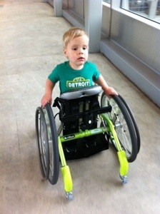 It is so very clear to us now that a wheelchair is often inevitable for many children with Spina Bifida. We know at least two families in Michigan that have children that walk – even walk without bracing (that's you, Gabe and Gray!), and by the age of about three or four, even they opt to provide a wheelchair as an option. It provides these children with more speed and independence. Even though these little superstars can and do walk, even jump and are starting to run, they tire so quickly and easily. There are certain cases where a wheelchair can help them keep up with peers and maintain independence (versus a stroller). So for Colten, who will require bracing for life and who knows what other mobility "tools" (walkers, crutches?), a wheelchair will always be an option. And having used the Bumbo wheelchair and now the mobile stander, it is something far less scary for us. It's just part of him and how he moves. And he moves in a LOT of ways!