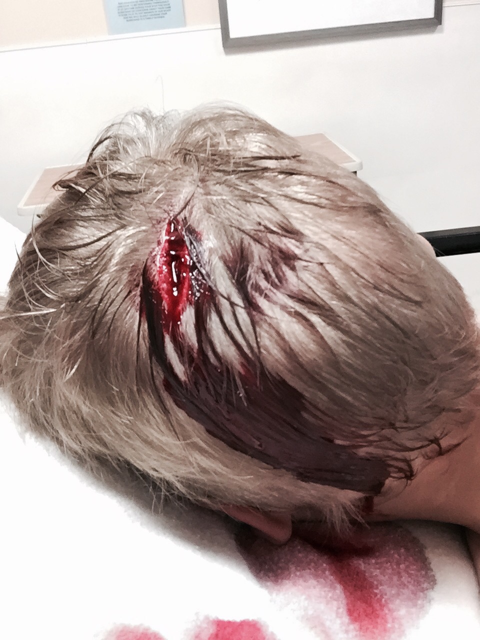 I had just put Colten and Max at the table for lunch and turned to get my own lunch ready. I heard a bang and knew a highchair (and child) had fallen. It sounded like Max’s chair and I heard no fussing. Then I turned around and saw Colten missing from the table – then I heard the screaming and crying. I ran over to scoop him up and held him, inspecting his face and mouth looking for the injury. My hand was on the back of his head while I carried him out from the dining area through the (off-white carpeted) living room. It was then that I felt the drips on my hand, looked, and saw blood dripping all over the carpet and noticed the trail behind us on the dining room tile (also white). I quickly carried him over to the kitchen, set him on the counter and grabbed a wad of paper towel to hold against his head. I couldn’t see what was back there but it was gushing. I thought for a few brief seconds of how I could manage getting him and Max into the car and driving to the hospital – then realized I could not do that and keep a compression on his head!