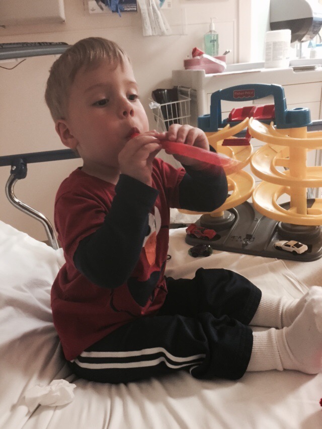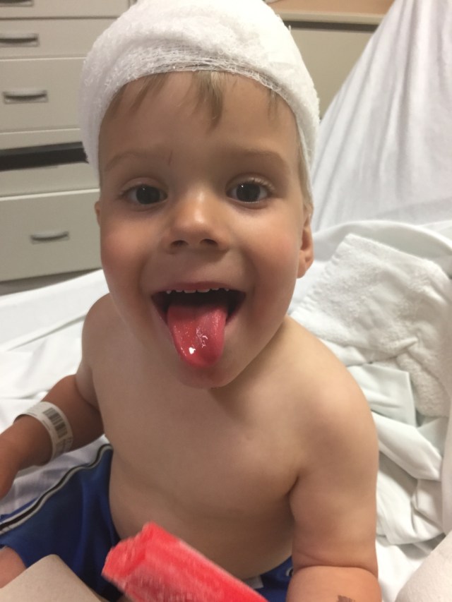 The hospital staff was great – Colten did an amazing job during the shots to numb him up and rested on me the whole time. For a 2″ laceration, because it was such a clean line cut, they only needed four stitches! Their first choice was to staple shut, but I informed them that Colten was scheduled for an MRI on Thursday, his annual follow-up for his VP shunt. So we certainly didn’t want to put metal in his head! The four stitches helped to realign the skin of the opening and they bandaged around to catch a little of the extra blood before we left.
