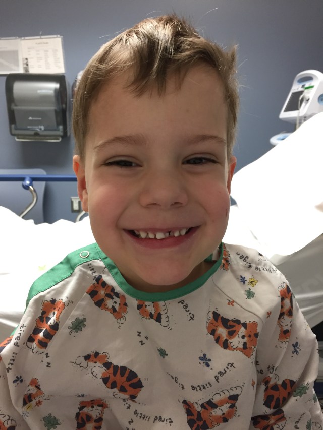 So here we are today for surgery #7. We are not at our typical children’s hospital. We are at one of the surgical centers this ENT works out of. There are definite advantages to using a children’s hospital for our other procedures, especially when a child needs anesthesia. Here at McLaren Macomb, Colten and I had to part ways at the door before anesthesia. The last time Colten had anesthesia at our children’s hospital, I was in the hospital bed with him until he was OUT. He gets a lot of anxiety with medical stuff (can’t blame him) and he kept telling me yesterday and today, “I don’t want to go to sleep. I don’t like the mask. It hurts my throat after.” Nothing like tugging at my heart strings! Even though he gets Valium/Versed ahead of time to help calm him, it does not appear to do enough. He used to get very loopy with it when he was younger, but not as much anymore it seems.