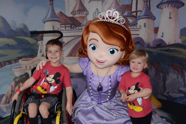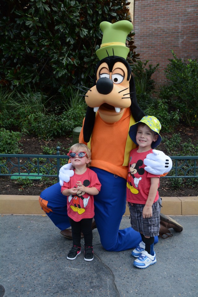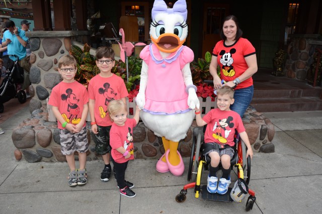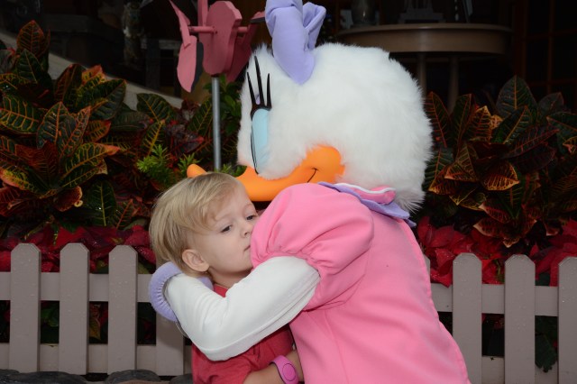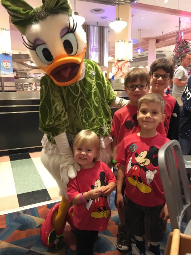 We did the same routine this morning upon getting to the park. Richard took Parker and Max in with no bags (quicker way to get into the park), and I kept my backpack, Richard’s backpack, and the two littles. I’ll say, this was a PAIN IN THE BUTT to do this solo, but it did allow Richard to get the boys signed up for the highly popular Jedi Training which fills up super fast and we couldn’t FastPass. Colten didn’t want to do it (until after he saw the boys do it – and at that point it was too late), so I took him and Sophia strolling through Hollywood Studios. We didn’t get far before we saw a short line and Daisy Duck, so we jumped in line and miraculously, Richard and the other two boys made it back to us after getting their time slot signed up.