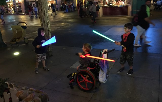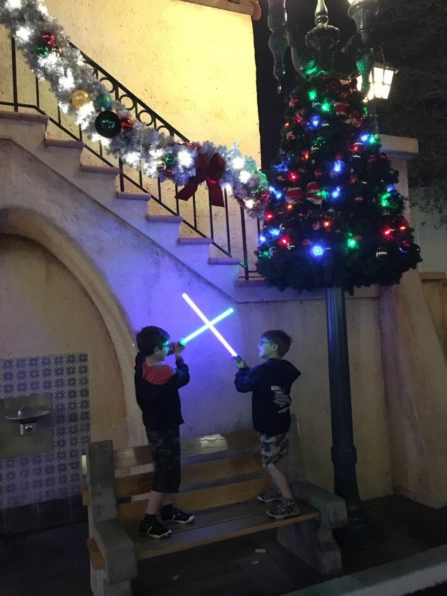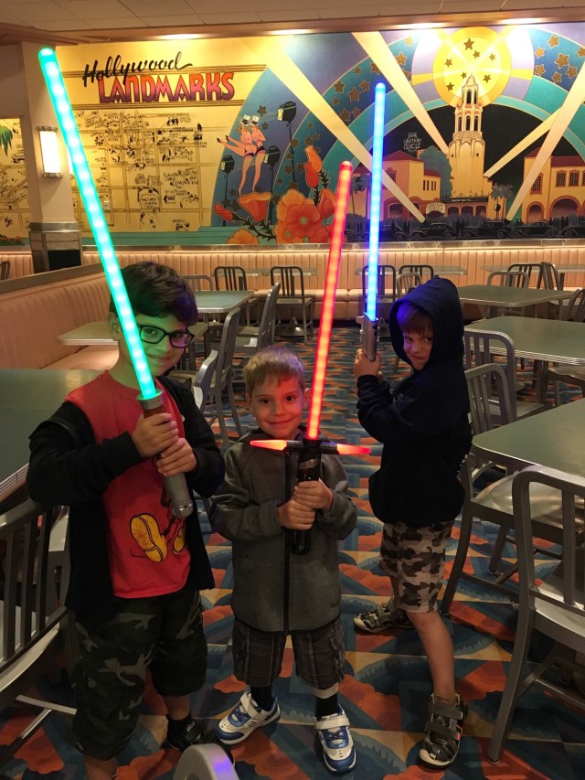 As we closed out the night, Richard had to get pictures selected from the Jedi Training, so we strolled out of the restaurant and headed to the customer service area. The boys all had their souvenir lightsabers…