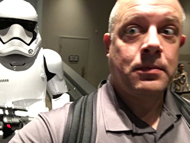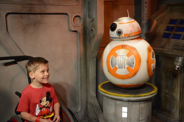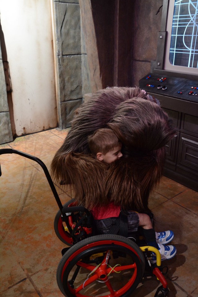 After pictures with the Storm Troopers, and getting two very nice pins from them, we were led the back way into the characters photo area. He was whisked in through back doors to the front of the lines to see Kylo Ren (he was VERY scared – again, these characters were very much IN character and Kylo is scary!), Chewbacca (who got some great hugs), and BB-8 (who got the biggest smiles).