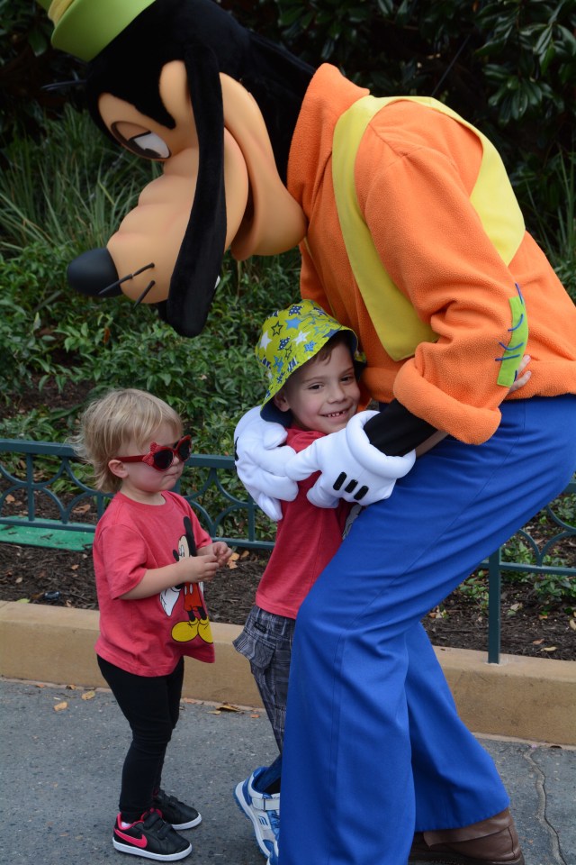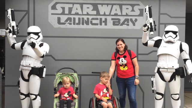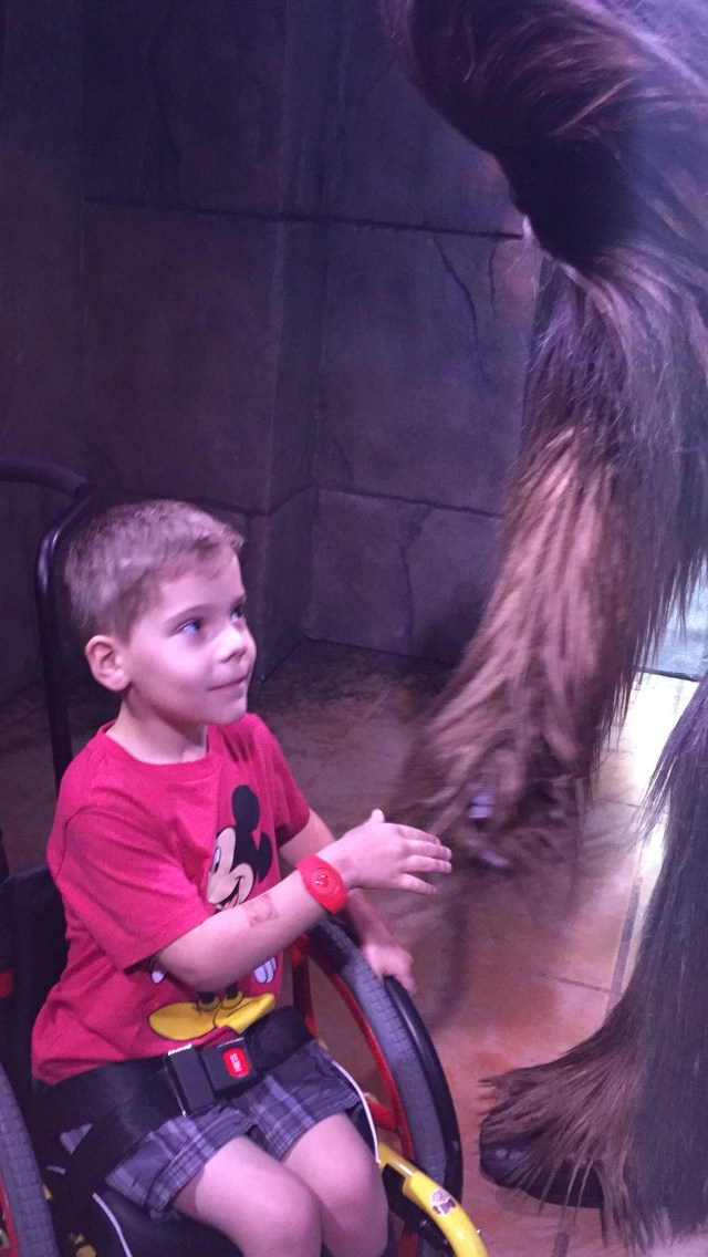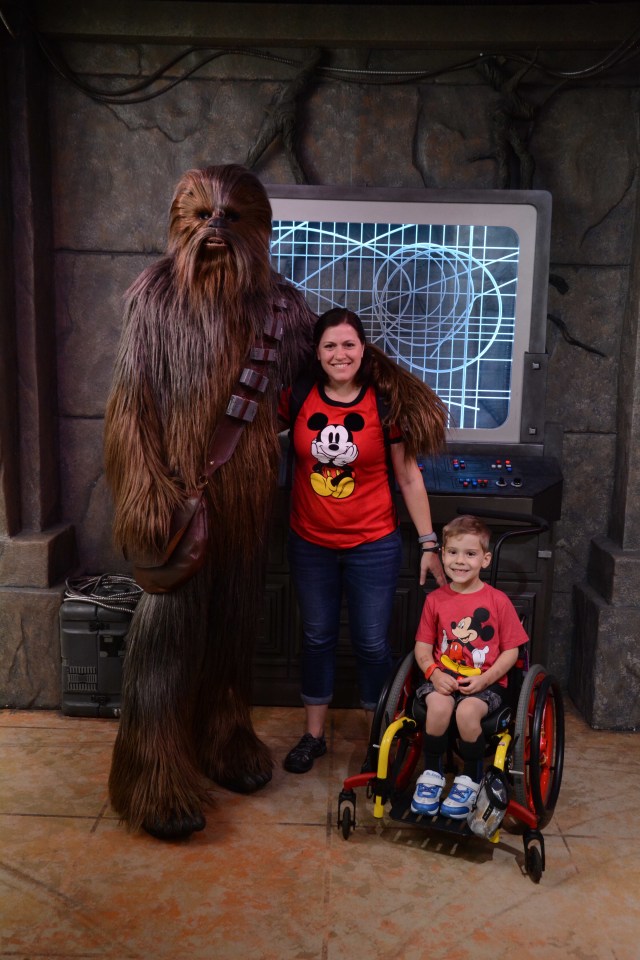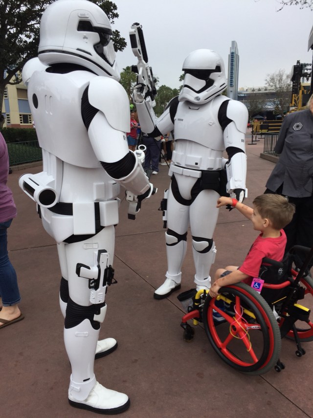 If you really don’t want to watch, the short version is that I guess Storm Troopers go through the park and “capture” kids (seems like it’s often kids with special needs from the stories I keep hearing)… I’m actually tearing up as I write this because it was just amazing. Colten was captured and we had to hightail it through the park following these very-much-in-character Storm Troopers. We were taken to a private photo shoot area that only kids captured by storm troopers get to go to. Other people on the path to the other Star Wars characters were all asked to keep walking – “private photo op in session”! Colten actually got kind of scared at this point because he thought they would put him on a scary ride – my naivety and excitement building didn’t help and I had to finally whisper to him at one point that “nothing bad happens at Disney” and reassure him that everyone was here to just give him a good time.