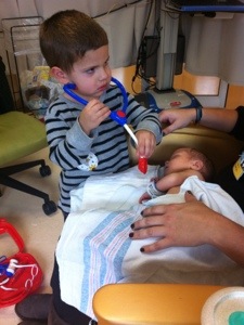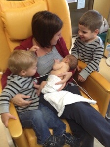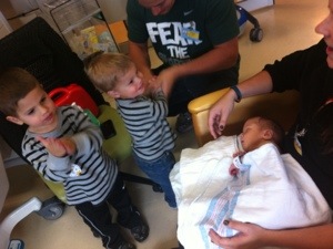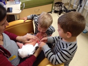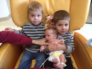 We are getting discharged! Colten has a few more tests tonight – a VCUG (please don’t ask me what it stands for – go look it up if you want to know) which will test reflux into the kidneys (schedule for 3pm), and an MRI (scheduled for 4pm) that will go “tip to tail”. The MRI isn’t really looking for anything, it’s more of a baseline of what his brain, specifically the Chiari II Malformation, and his spine look like now so we have something to compare to as he grows. As long as Colten sleeps through the MRI, or is at least mostly still, they won’t have to sedate him and we can go home TONIGHT. If they need to sedate him, we go home tomorrow morning. I CANNOT WAIT to get home with ALL my boys! And my bed. I miss my bed.