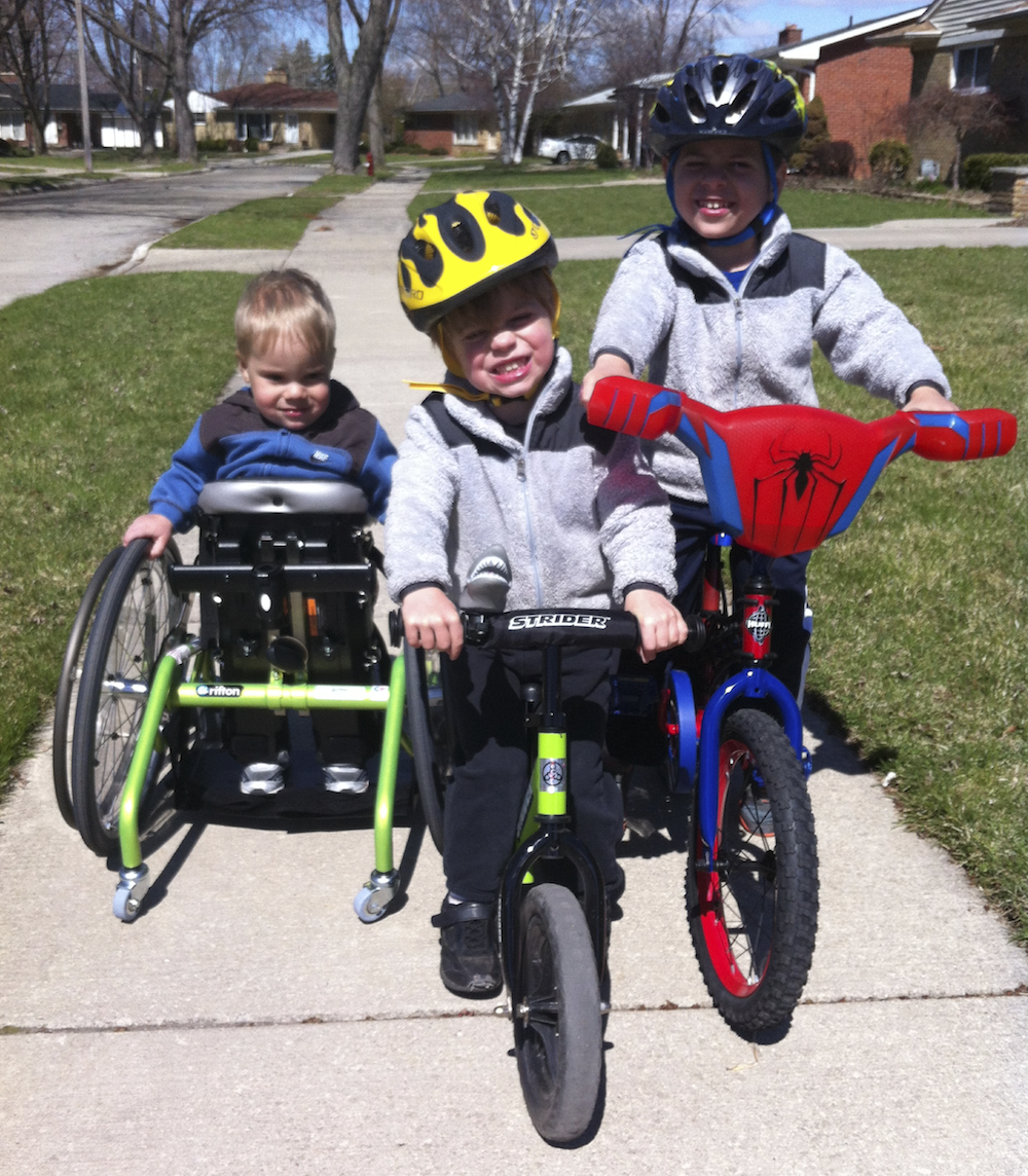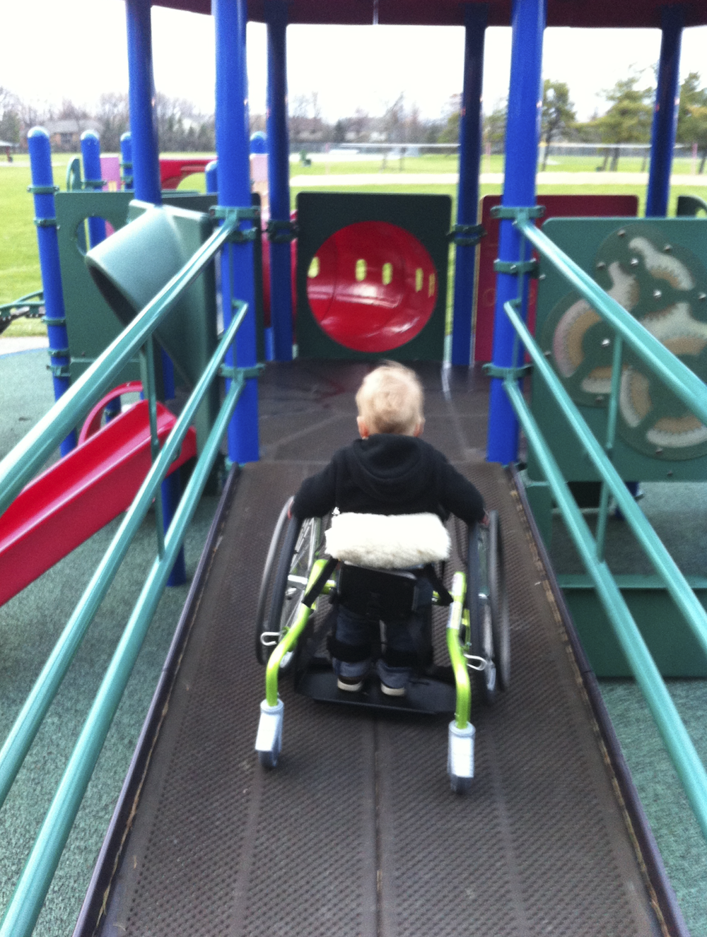 We had few discipline issues arise though that are real and new… The first was Parker pushing Colten as Colten was wheeling down. This got a nice big scolding and some sit down time. I reiterate quite often these days to the boys that "Colten is in charge of his wheels, not you." It's hard to make them truly realize it, but how would they feel if someone else controlled their legs?! Parker did agree that he would not like to be pushed down the ramp from behind either so at least at 5 years old, it sank in. For the moment at least. Then Colten took it upon himself to wheel right into Max without stopping at all. And Colten got a talking to. He's not entirely safe with his wheels yet so we have to watch and teach him. Running into someone as a toddler when you're bobbing and weaving is one thing. Wheeling them over in a wheelchair is a whole other story. And hurts! This might take some time to instill.