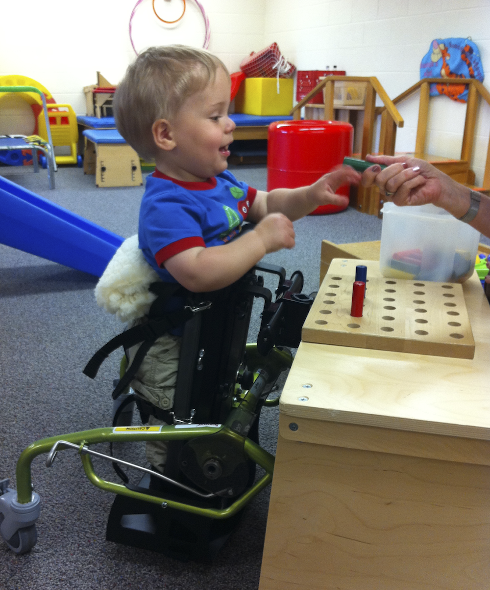 It is so very clear to us now that a wheelchair is often inevitable for many children with Spina Bifida. We know at least two families in Michigan that have children that walk – even walk without bracing (that's you, Gabe and Gray!), and by the age of about three or four, even they opt to provide a wheelchair as an option. It provides these children with more speed and independence. Even though these little superstars can and do walk, even jump and are starting to run, they tire so quickly and easily. There are certain cases where a wheelchair can help them keep up with peers and maintain independence (versus a stroller). So for Colten, who will require bracing for life and who knows what other mobility "tools" (walkers, crutches?), a wheelchair will always be an option. And having used the Bumbo wheelchair and now the mobile stander, it is something far less scary for us. It's just part of him and how he moves. And he moves in a LOT of ways!