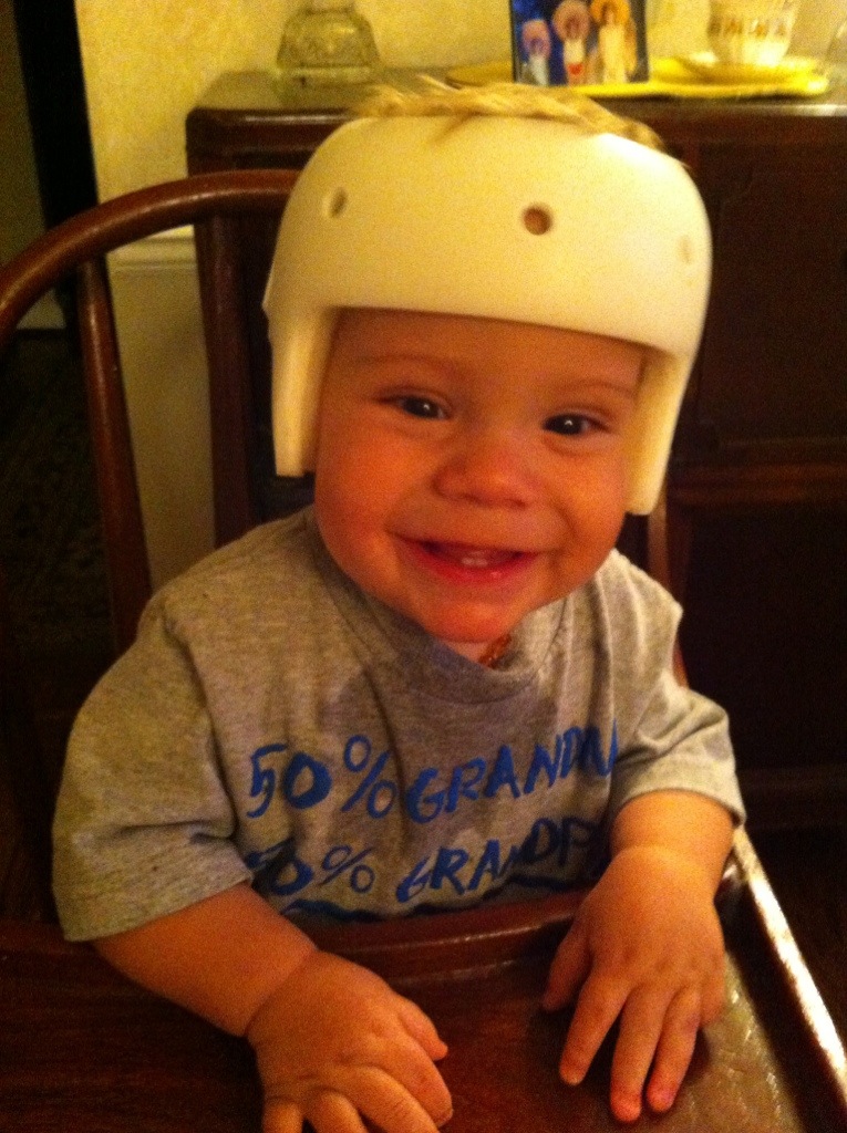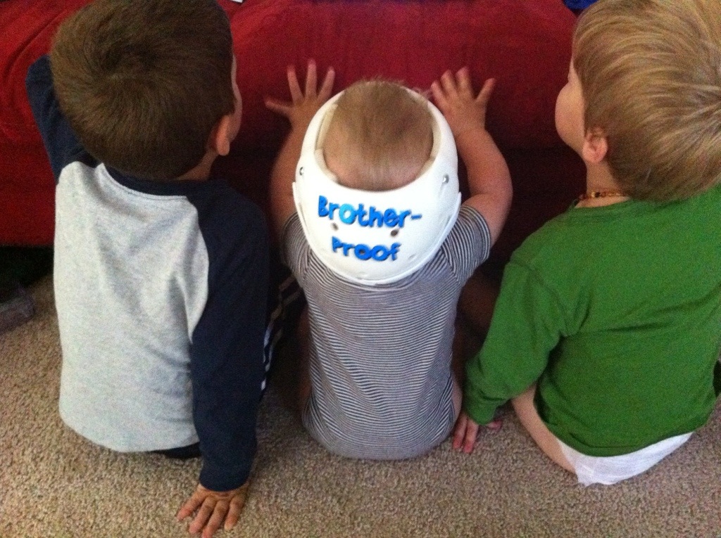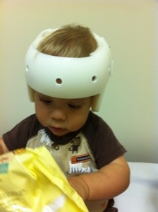 There are a few things still concerning us about the shape of his head – it’s not just for looks! One is that he has an Arnold Chiari II Malformation (it goes along with Spina Bifida). In short, this is when the back part of the brain, the cerebellum, drops down into the spinal column at the base of the skull. If I recall correctly, the malformation is part of what contributes to his hydrocephalus as well. This Chiari II can be mild or severe, symptomatic or asymptomatic. Colten’s is mild and asymptomatic. Yay! Our concern is whether a too-narrow back of the skull will make it more likely that his Chiari could worsen or become symptomatic. Surgery for that issue is a doozy! The orthotist recommended we refer that question to neurosurgery so we’ll come back to that another day. Another issue is a bit selfish – a bike helmet. Our family bikes a lot — we take the kids, everyone wears helmets. We of course want to include Colten in that and based on his head shape, a helmet will be difficult to properly fit for protection. So if we cannot find one that works, we’ll have to explore some custom option for him. The last issue (besides of course that this kid makes it really difficult to get a shirt on over his head) is his left eye. It tends to float inward more often than it should and one doctor told us that because that side of his head is flat, it’s possibly pressing on the external eye muscles which control that motion. That doctor felt that as his head rounded out, we would see that improve. So far it’s not getting much better so we’ll watch that and talk with one of his other doctors about that in the coming weeks.